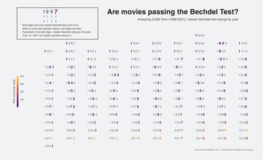 Each year displays four digits (like "1997"), and whichever position is bold tells you the median Bechdel score. Position 0 means score 0, position 3 means score 3. We pass the test when the score is 3! Meanwhile, the color intensity shows what percentage of films achieved a perfect score, ranging from deep purple (few) to bright yellow (many).