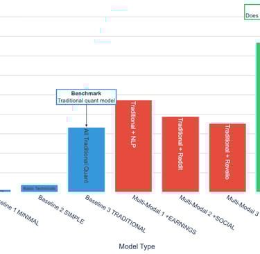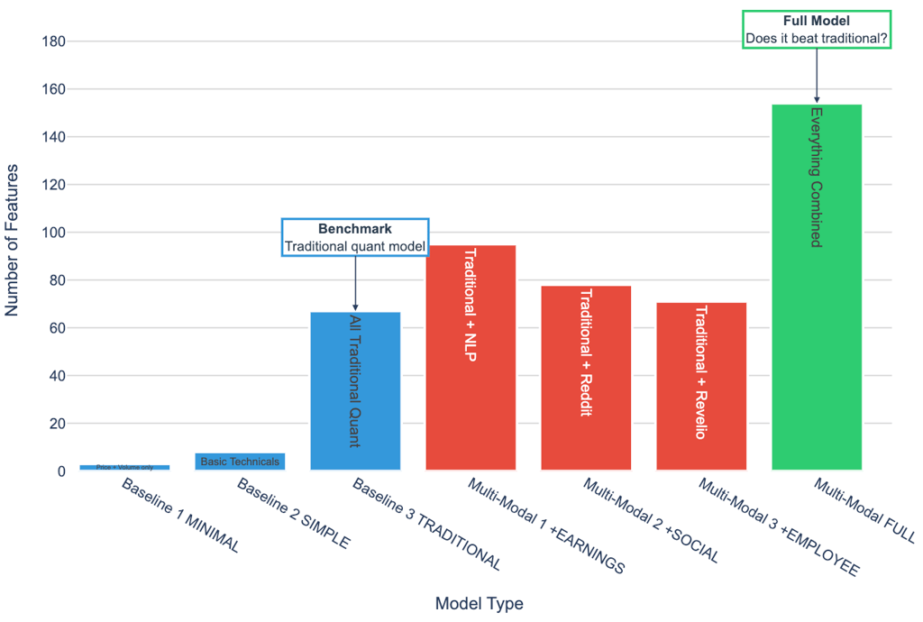 This structure gives us a clean way to answer the central question: Does predictive performance improve as we add richer, more unconventional signals? If the full multi-modal model fails to outperform Baseline 3, then alternative data either isn’t informative—or we haven’t yet learned to unlock its value.