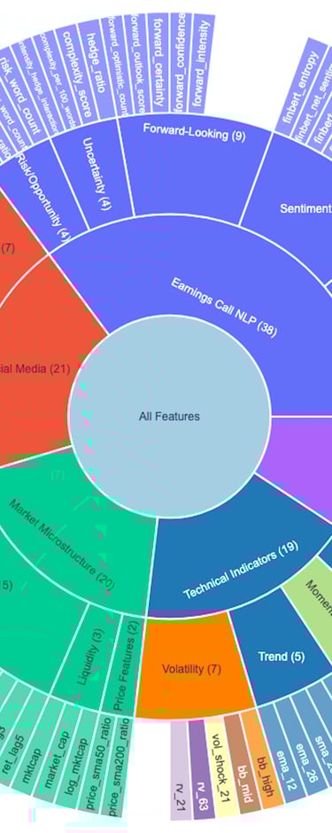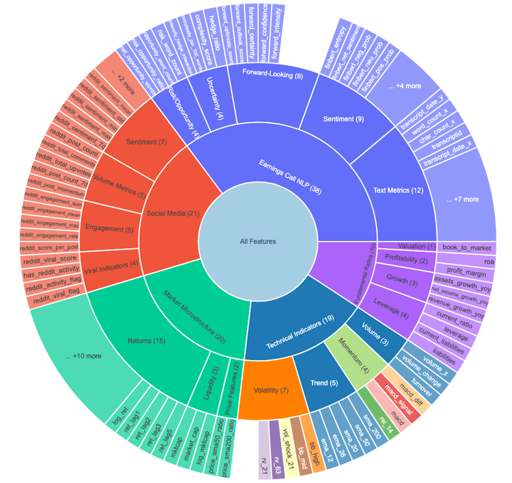 All four sources are aligned into the same firm–date panel, so when the model makes a prediction for a given trading day, it sees: how the stock is trading, how the business looks on paper, how management is talking, and how the crowd is reacting — all based only on information that was actually available at that time.