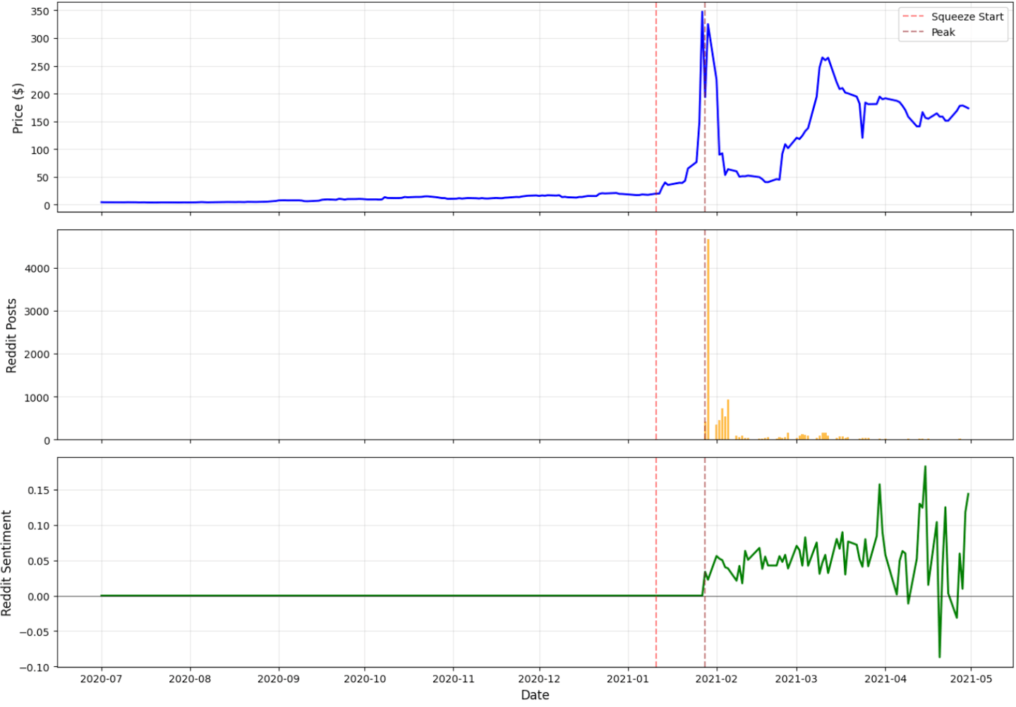 The three-panel chart makes the dynamic of the GameStop squeeze immediately clear. Price remains flat through December, then surges abruptly after January 11, peaking at more than $340 before falling back. Reddit activity follows the same trajectory: virtually nonexistent for months, then exploding to over 4,600 posts per day at the height of the frenzy. Sentiment mirrors this pattern as well—steady and neutral at first, rising sharply during the squeeze and becoming highly volatile once the peak passes. Taken together, the panels show a tight coupling between social media coordination and market behavior. Reddit wasn’t reacting to the price movement; it was shaping it. Price alone cannot explain the event—attention and sentiment were the real drivers.