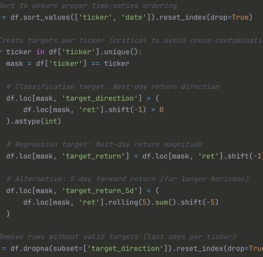 This is where the magic happens. We transformed raw data into 108 engineered features across five categories, each designed to capture a different dimension of market behavior. But rather than just building features blindly, we adopted a hypothesis-driven approach: every feature needed a clear economic rationale for why it might predict future stock movements.