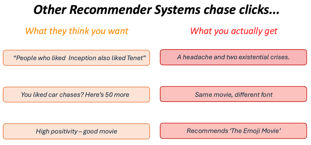 We've all been there—scrolling endlessly through Netflix, not sure what to watch. Traditional recommendation systems suggest movies based on what you've watched before or what's popular, but they miss a crucial element: how you're feeling right now?