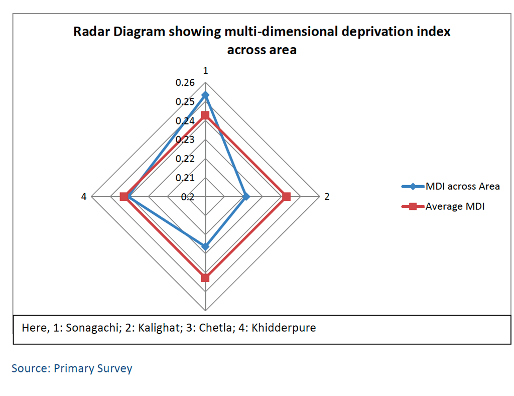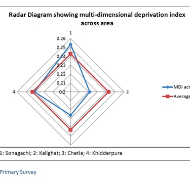 To better understand the multifaceted challenges these children face, we developed a deprivation index based on seven key indicators, including addiction, school dropout, lack of extracurricular activities, living conditions, financial security, and labor participation. Our analysis revealed that 49.4% of children were multidimensionally deprived, scoring over 40 on our 100-point scale. Sonagachi showed the highest deprivation rate at 52.2%, with children experiencing hardship across multiple dimensions simultaneously.